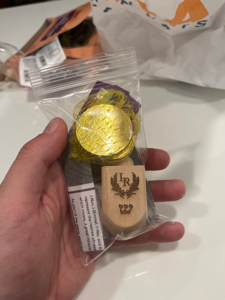 4 sided dreidel with my fav labels on it! Comes with the rules and some chocolate coins (gelt)